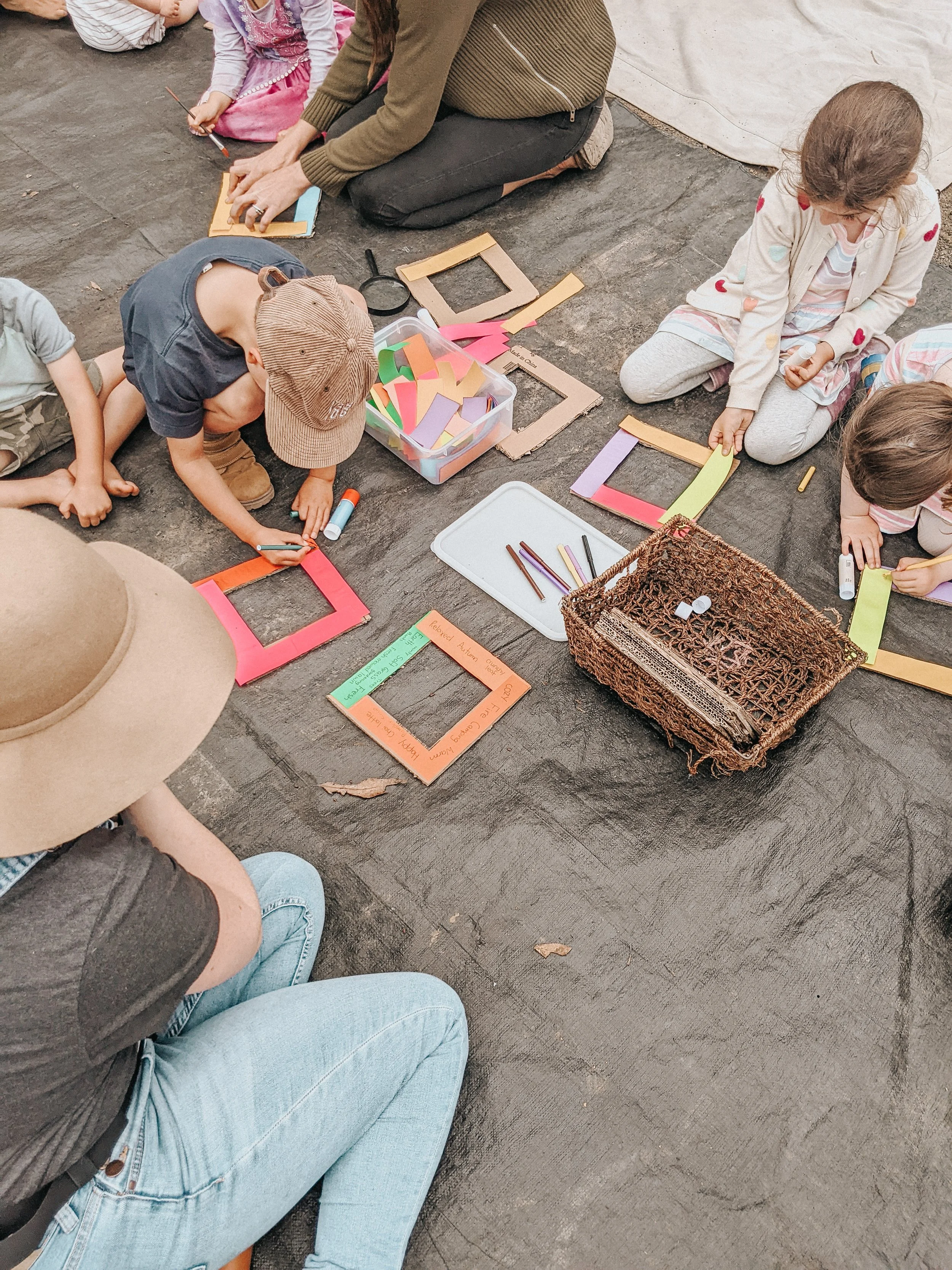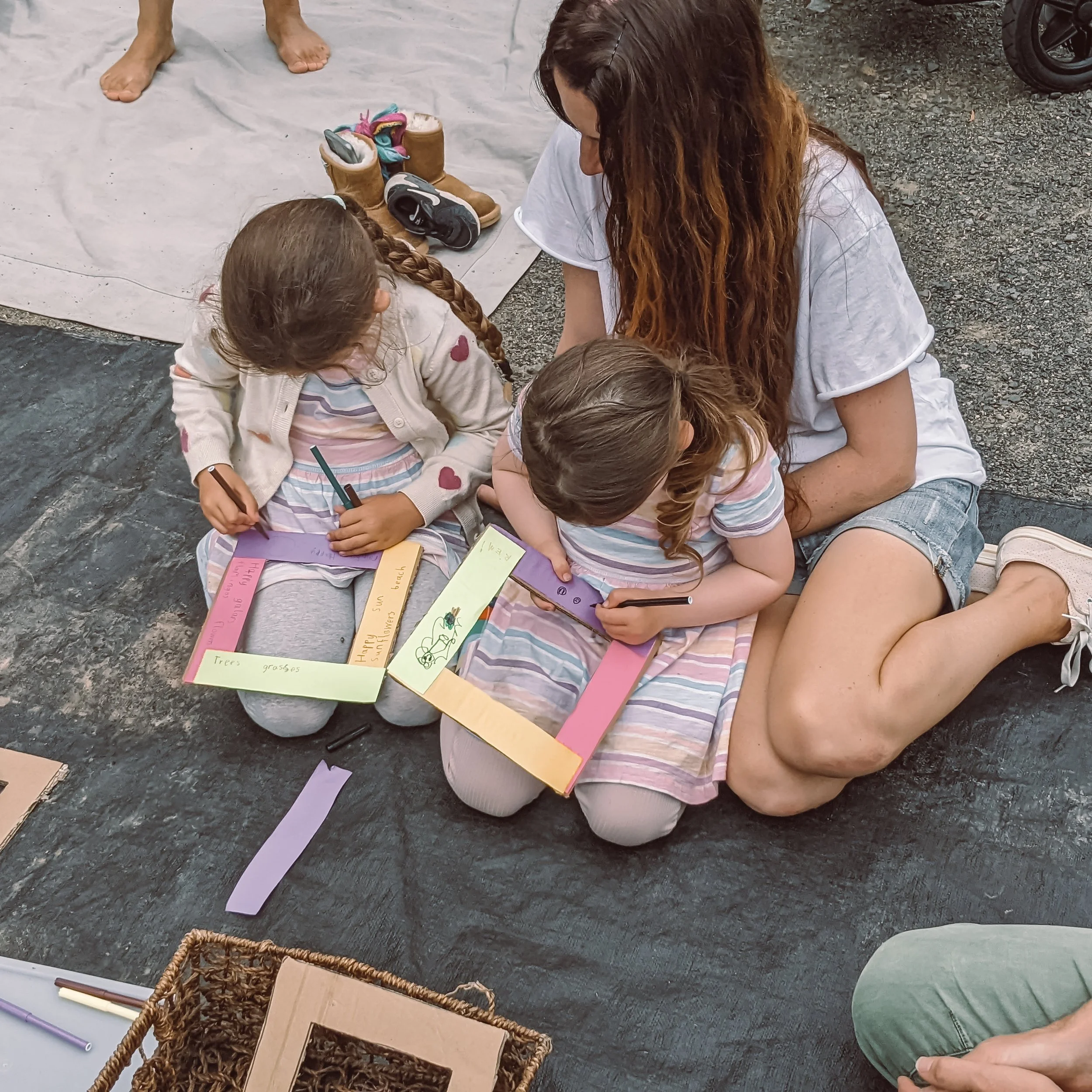 We asked our local dollar store if they had spare cardboard out the back and they happily handed some over. From there, we cut out simple photo-style frames and turned them into little windows of self expression.